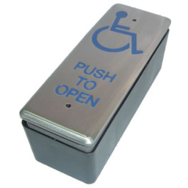Botão de Acionamento interno (botoeira - push botton) para abertura de porta fechada (saída), por equipamentos de controle de acesso, da linha BSI Latina, em tamanho grande, sendo mais conveniente e especialmente feita para acesso por cadeirantes e deficientes físicos.